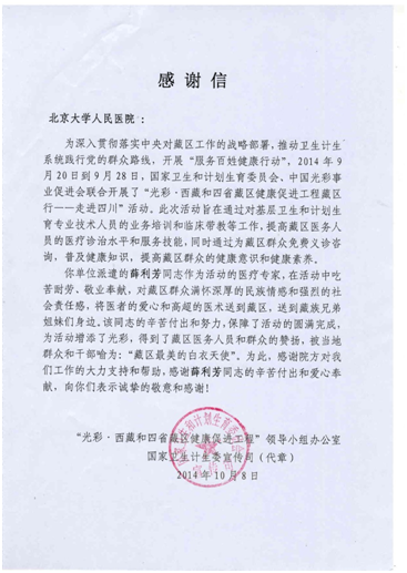 近日,为落实中央对藏区工作的战略部署,提高藏区农(牧)民健康素养、加强藏区基层卫生计生服务机构和人员能力建设, 国家卫生计生委开展了“光彩·西藏和四省藏区健康促进工程藏区行_走进四川”活动。北京大学人民医院超声诊断科薛利芳主任医师受国家卫计委的委派前往参加了此次活动,并圆满完成了对藏区基层卫生和计划生育专业技术人员的业务培训和临床带教等工作。