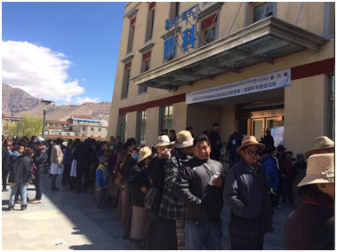 4月17日一大早,诊室外就有很多充满希望的藏民患者在守候了。经过短暂而友好的开幕仪式,人民眼科专家志愿者就立刻进入诊室开始义诊。面对患者的急切,黎教授耐心细致,明确诊断,指导治疗;梁大夫沉稳细心,仔细检查,详细解答;曲大夫仔细关注需要进行手术和药物注射的患者,同时悉心指导着当地的藏族医生同道。藏族同胞们好不容易迎来远方的专家义诊,诊室外人山人海,每次打开门,必有更多患者同胞涌到大夫身边。