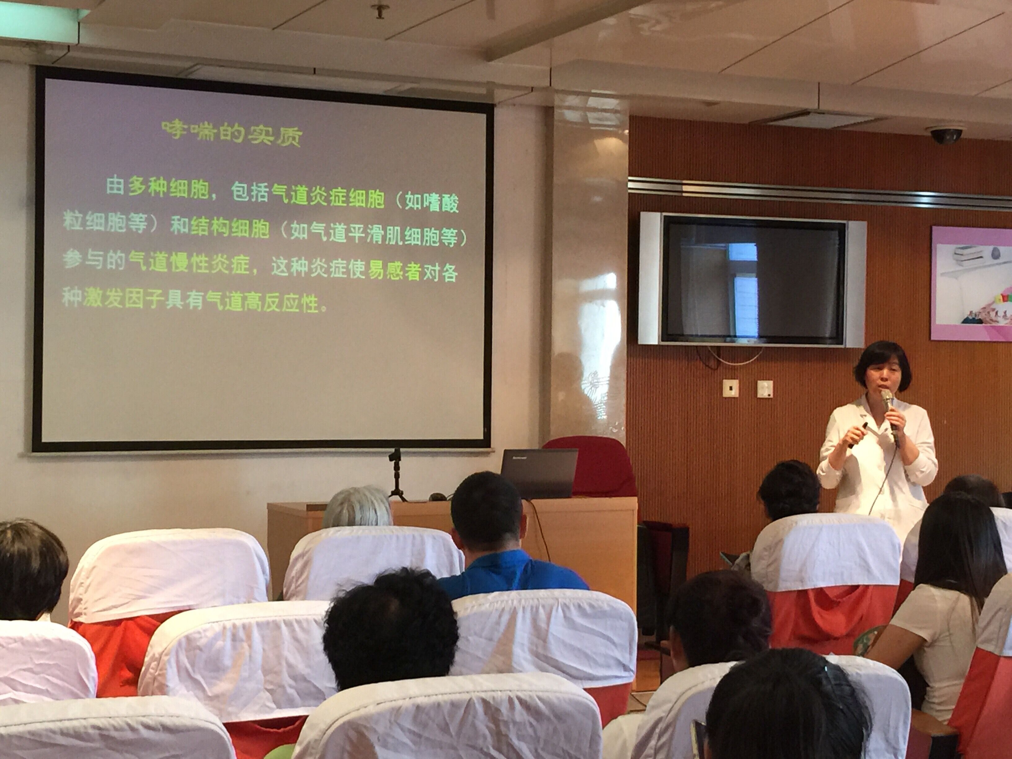 余兵副主任医师从哮喘的概况及实质,逐渐深入到哮喘的诱因及症状,向患者们详细进行了讲解,让患者们对哮喘有了宏观的认识后用幽默诙谐的语言介绍了引发哮喘的诱因,譬如居室环境、自然环境、雾霾、气味与嗜好、季节更替、疾病与状态、药物及食物等。随后余兵副教授又带大家了解了哮喘的症状,如呼吸性呼吸困难、哮鸣、胸闷、咳嗽及咳痰。最后,余大夫还着重介绍了咳嗽变异性哮喘、阿司匹林性哮喘、运动性哮喘等特殊类型哮喘。让患者对哮喘有了更加全面及深刻的认识。