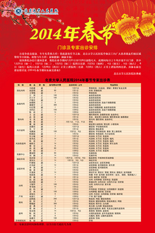 按国务院办公厅通知要求,我院在春节期间1月31日至2月6日放假七天,此期间每日上午均开设半日门诊,其中1月31日(初一)、2月1日(初二)、2月2日(初三)按周日出诊,2月3日(初四)、4日(初五)、5日(初六)、6日(初七)按周六出诊;1月26日(周日)正常上班按周三出诊, 2月8日(周六)正常上班按周四出诊。具体专家出诊安排详见《2014年春节期间专家出诊表》。