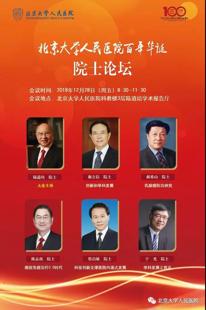 此次论坛是北京大学人民医院百年华诞学术周压轴学术盛宴,特邀医院德高望重的陆道培院士作为大会主席。北京大学医学部主任詹启敏院士、山东省眼科研究所谢立信院士、天津市肿瘤研究所郝希山院士、空军军医大学陈志南院士、上海瑞金医院宁光院士5位学术巨擘做精彩报告。