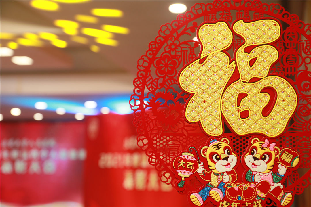 金牛辞岁寒风尽,玉虎迎春喜气来。载歌载舞聚一堂,共谱新年新篇章。