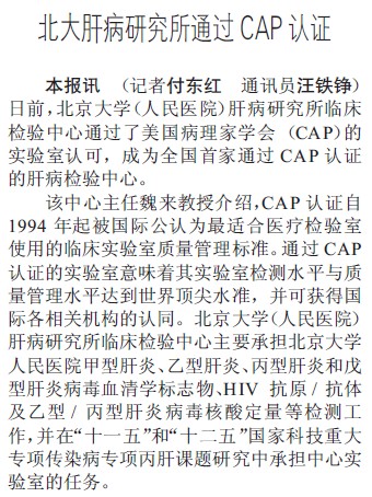 健康报:北大肝病研究所通过CAP认证