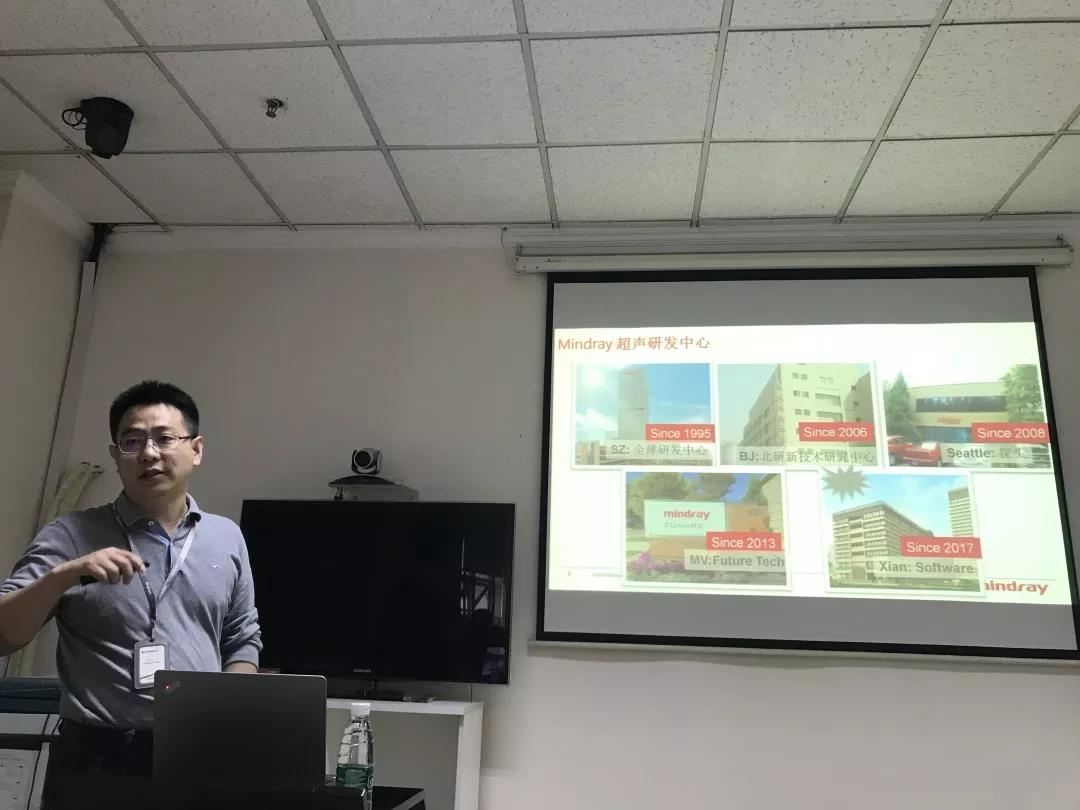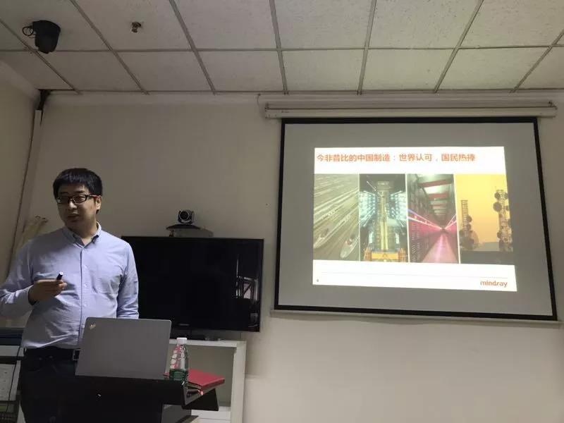 师生一行受到了公司行政主管王艳鸣等工作人员的热情接待。首先是高级工程师、国家专利金奖获得者郭文恒总工程师向我们介绍了迈瑞的现状,在IVD相关技术及检测设备等领域,目前国外企业占据了大部分市场份额,但是起步较晚的国内企业在研究人员的共同努力下,也取得了不菲的成就。郭文恒研究员自信地表示,迈瑞将在未来几年内继续快速成长,与国外巨头一拼高下。接下来,丛云飞工程师从超声领域的研发及投入使用情况,用数据和直观的图示让我们看到了一个已然兴起并将更加蓬勃的研发公司。随后,我们参观了迈瑞北研正在研发的几项产品,并聆听了工作人员对研发过程的讲解。