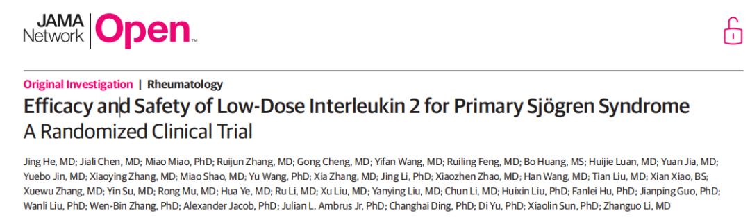 最近,北京大学人民医院、北大-清华生命科学联合中心栗占国教授课题组在JAMA Network Open杂志发表论文Efficacy and Safety of Low-Dose Interleukin-2 for Primary Sjögren’s Syndrome: A Randomized Clinical Trial。该研究通过双盲随机安慰剂对照研究(RCT),证明了低剂量IL-2(Ld-IL2)治疗原发性干燥综合征的有效性以及安全性。同时,对IL-2治疗干燥综合征的机制进行了探索,为干燥综合征免疫靶向治疗提供了临床和实验依据。