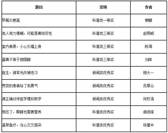 评选邀请了健康报、北京日报、北京晚报、北京青年报等资深编辑、记者以及市卫生局宣传处、科教处、宣传中心的领导担任评委。评委工作分初筛、初评和终评三个环节。医院临床营养科柳鹏营养师的文章《早餐价更高》获得好新闻科普类一等奖。