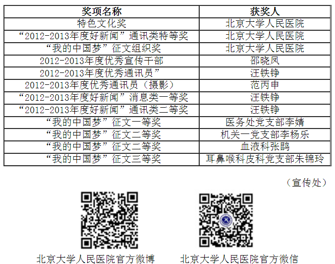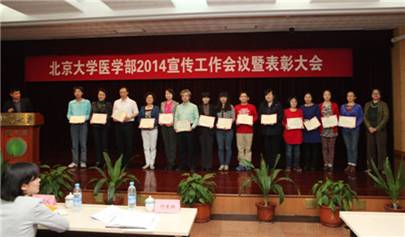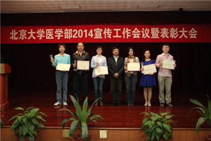 北京大学医学部党委宣传部于4月8日下午在医学部逸夫楼报告厅召开医学部宣传工作会议暨表彰大会。北京大学人民医院上一年度在宣传工作方面积极进取,不断创新,得到了医学部的肯定,在表彰会上收获颇丰,荣获医学部特色文化奖、“2012-2013年度好新闻”通讯类特等奖、中国梦征文组织奖。同时还有7名在宣传及文化建设方面突出的个人荣获了单项奖。