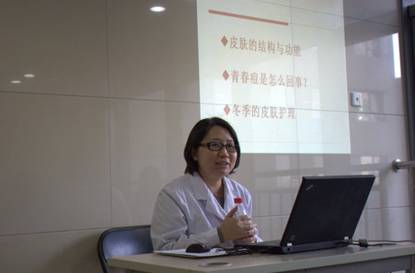 外面凛冽寒风的呼啸声令人闻而生畏,而住院部的一隅却笑语盈盈,令人心生暖意。2013年12月18日,北京大学人民医院医务社会工作暨志愿服务工作部在住院部5A病房外,为患者及家属们举办了主题为“冬季皮肤保养”的健康讲座,皮肤科李厚敏大夫为大家普及冬季护肤的注意事项,数十名听众参与讲座。
