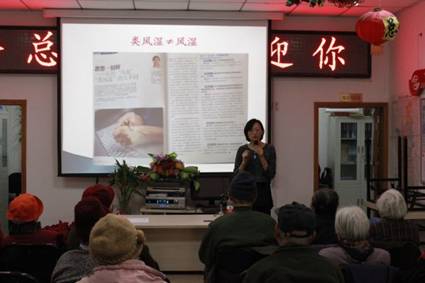 随着人们生活节奏的不断加快, 生存压力也随之增大,越来越多的人患上免疫性疾病。为了向广大中老年群众普及类风湿关节炎的基本知识,协助他们进一步了解类风湿关节炎,以实现早发现、早治疗的目标,北京大学人民医院社区健康宣教活动于2013年12月3日走进全总社区,邀请风湿免疫科叶华副主任医师作为主讲人,吸引了社区的中老年居民来到现场。本次活动是北京大学人民医院开展社区健康教育系列讲座的第八十期,同时也是北京大学人民医院“志愿北京之白衣天使行动”第二十一期活动。