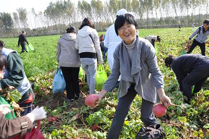 2013年10月23日下午,北京大学人民医院180余名在职和离退休职工在菜蔬种植园丰收之际热火朝天地采摘卞萝卜。大家齐心协力、干劲十足,仅1个小时的田间劳动就拔出卞萝卜1万5千多斤。看着自己的劳动成果,大家都露出了心满意足的笑容。大家纷纷将紫红色又圆又大的卞萝卜骄傲地举起来展示,田地间顿时一派“大红灯笼高高挂”的景象,喜庆又壮观。
