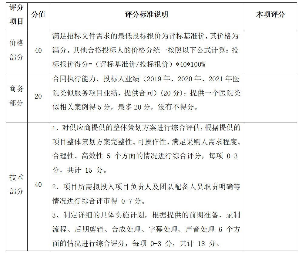 2、评标委员会将按照采购文件的有关规定和有关法律法规的规定,本着公平、公正、科学、择优的原则,对初步审查合格的投标进行以下各方面的综合评议。每个评委独立评分,所有评委评分的总分,即为每个投标人的最终得分。若总得分相同的,按价格部分得分顺序排列。