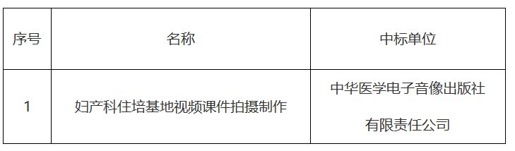 我院于2021年10月15日对妇产科住培基地视频课件拍摄制作服务项目进行院内招标,中标结果如下: