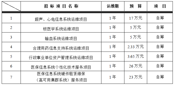 为满足临床科室需求,医学装备处拟对以下信息项目进行院内招标采购,采购项目的内容及金额见下表,招标要求详见附件:
