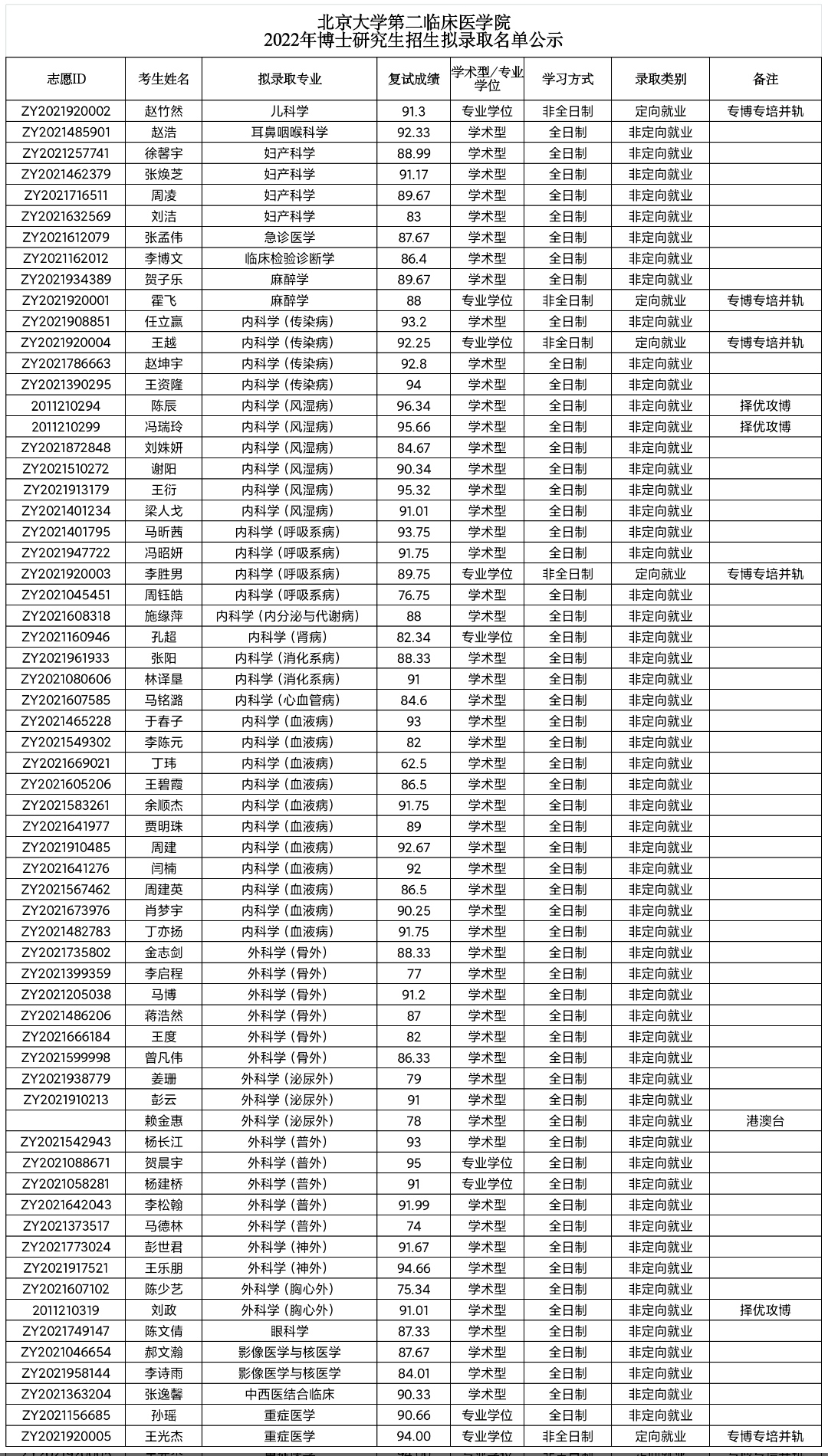 北京大学第二临床医学院 2022年博士研究生招生拟录取名单公示