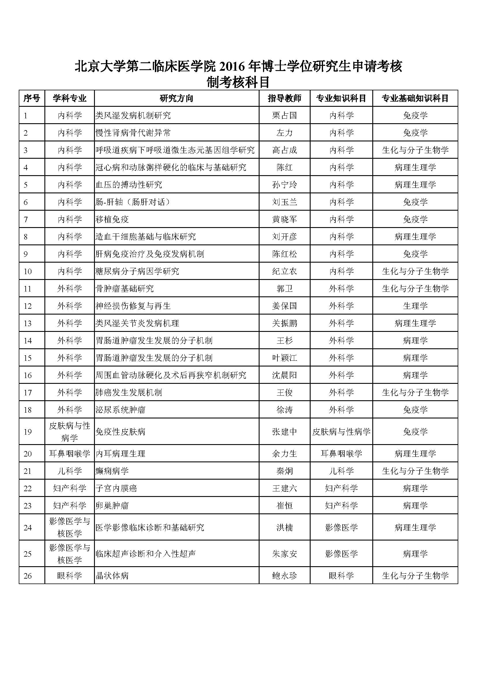 专业基础知识:考核科目参见《北京大学第二临床医学院2016年博士学位研究生申请考核制考核科目》(见附件)。