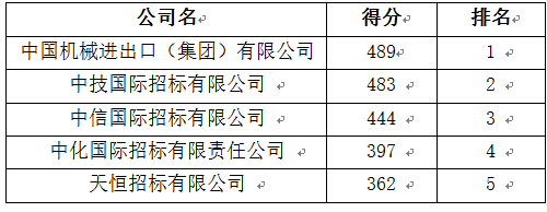 跟据评分结果,及实际招标工作情况,决定选取排名前两家:中国机械进出口(集团)有限公司、中技国际招标有限公司,作为我院2016年-2017年招标代理公司。