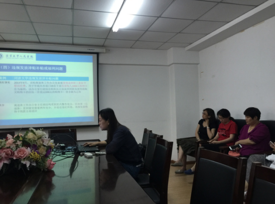 会议邀请纪委委员、监察办王静副处长做专项报告,她对近期在教育医疗领域中违反中央八项规定精神的案例进行了通报。王静副处长共通报十九个案例,她详细介绍了违纪事实及相关处分。