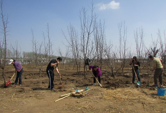 经过一段时间车程,大家来到曹刘各庄村。这是通州区县的一个自然村,环境整洁,空气清新。植树活动在大家的欢声笑语中开始了。以前总以为种树是件很容易的事情,没想到真的实践起来还是很有学问的。在工作人员的示范下,大家很快掌握了种树要点,两人一组,挥锨铲土,栽种浇水,既分工协作又配合默契。有的老师有种植经验,树坑挖得又深又好,引得大家惊羡不已,植树现场洋溢着欢乐的笑声。很快,十几棵小树苗就在树园里安了家。“照相了,发微信啊”随着一声招呼,大家纷纷来到小树苗前拍照留念。鲜红的党旗、幸福的笑容,在镜头中定格成永远。