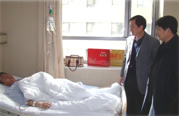2014年3月20日上午,北京大学人民医院总务处党支部彭洪书记、总务处副处长侯志骅、职工代表白结来到肝胆外科病房,探望生病住院的总务处职工老周(化名),为他送去了温暖与关怀。